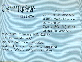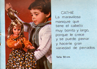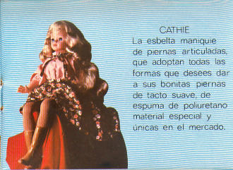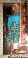 La poupée Cathie espagnole présentée ci-contre présente quelques différences : la qualité du plastique (le bout des doigts ont verdi sur cette poupée), les yeux (ressemblent aux yeux utilisés en 1983/84 chez Bella pour le modèle Nathie), le motif de la robe (existe en bleu, orange et rose)
